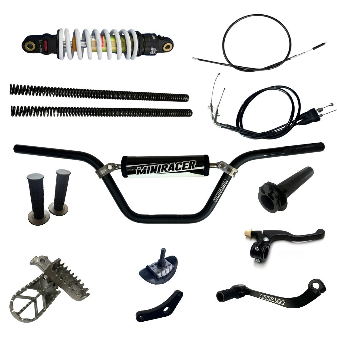 The MiniRacer Adult Essentials Kit includes our MiniRacer Satellite Series Handlebar and Suspension Kits, and host of must have protection mods you need to get out there and rip on your CRF110.